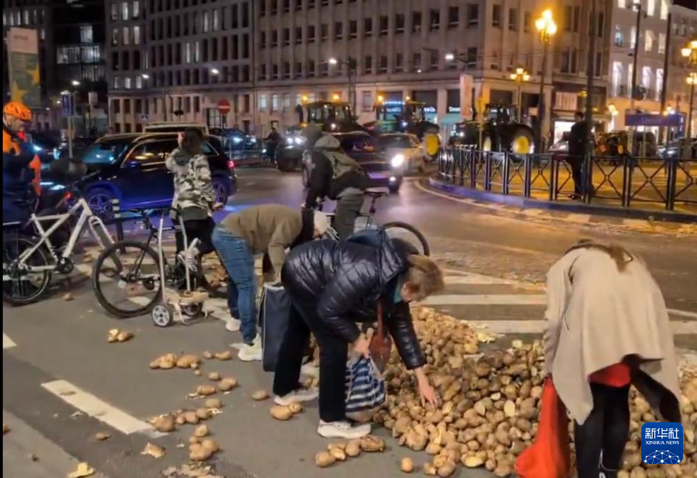 12月18日,在比利时布鲁塞尔,一些市民捡拾示威者遗弃的土豆(视频截图)。新华社发