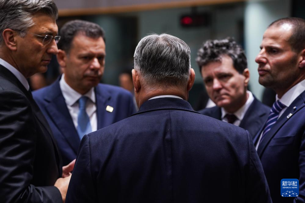 12月18日,在比利时布鲁塞尔,匈牙利总理欧尔班(中)与克罗地亚总理普连科维奇(左一)、葡萄牙总理蒙特内格罗(左二)、罗马尼亚总统达恩(右二)和马耳他总理阿贝拉(右一)在欧盟峰会前交谈。新华社记者 彭子洋 摄