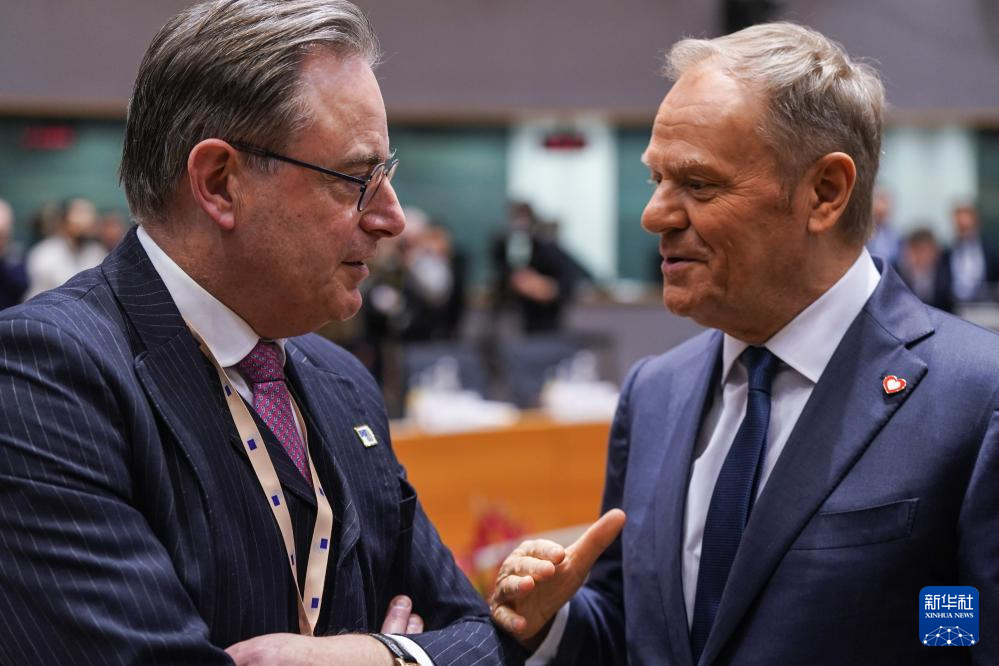 12月18日,在比利时布鲁塞尔,比利时首相德韦弗(左)与波兰总理图斯克在欧盟峰会前交谈。新华社记者 彭子洋 摄