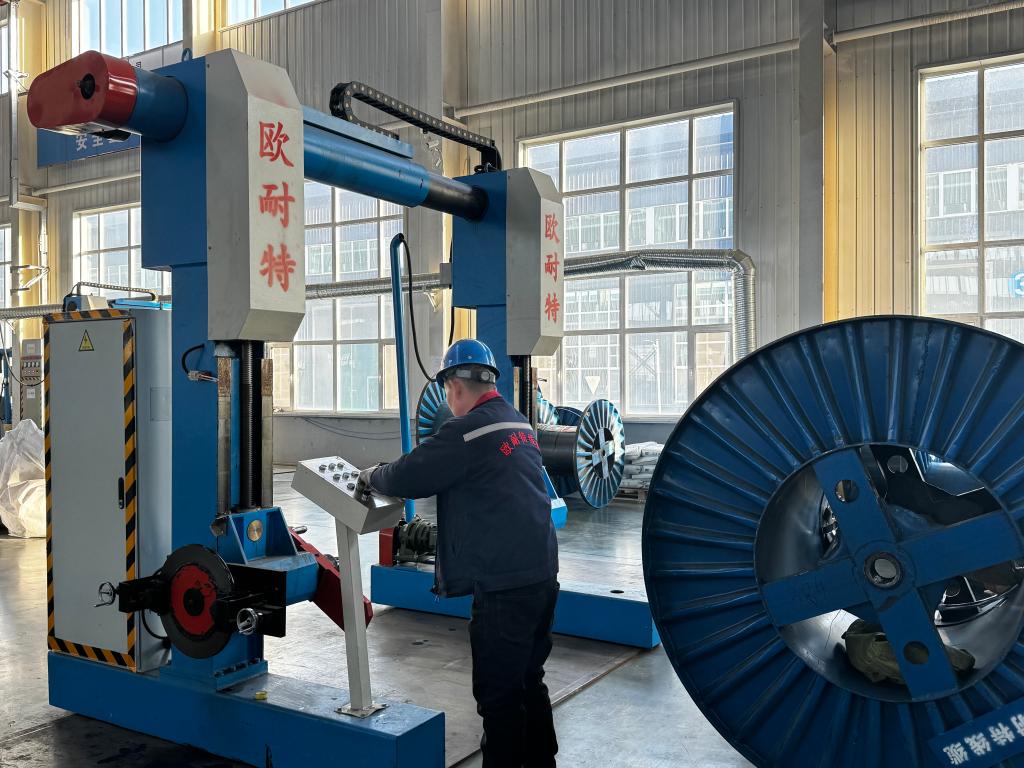 欧耐特线缆集团的生产车间里,智能机械臂操控着无氧铜线盘平稳转动,铜线在各类精密装置间有序穿行,一根根新能源特种电缆在这里成型。