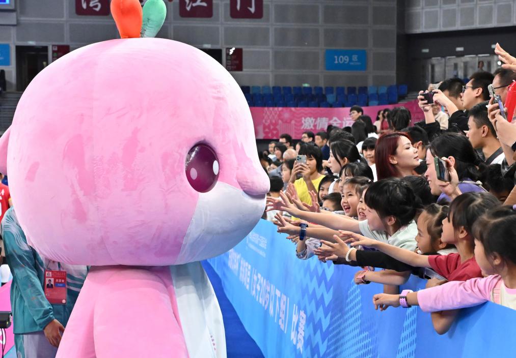 11月16日,吉祥物“乐融融”与观众互动。新华社记者 李鑫 摄