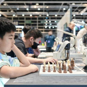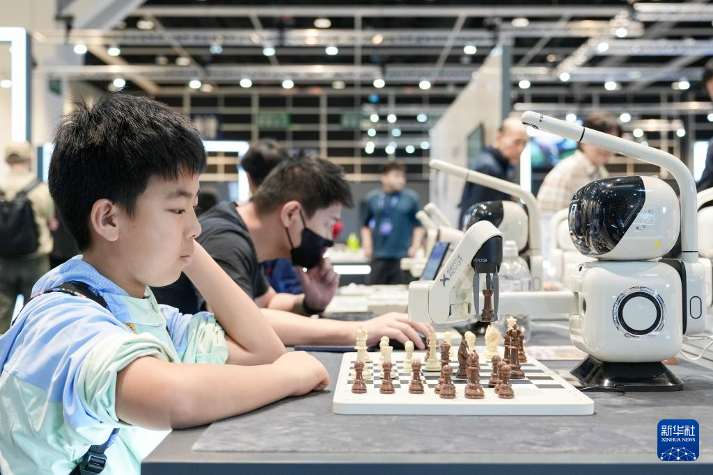 12月19日,一名儿童在首届香港国际AI艺术节上与机器人对弈。新华社记者 朱炜 摄