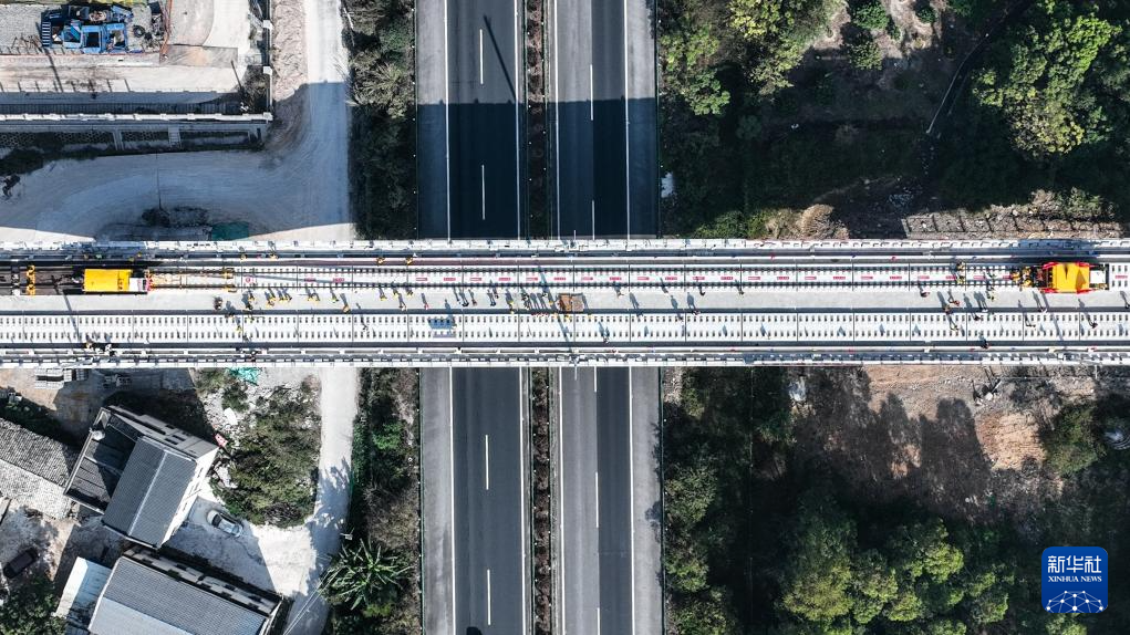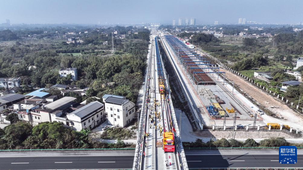 12月20日,铺轨机在北流市境内施工(无人机照片)。新华社记者 张爱林 摄