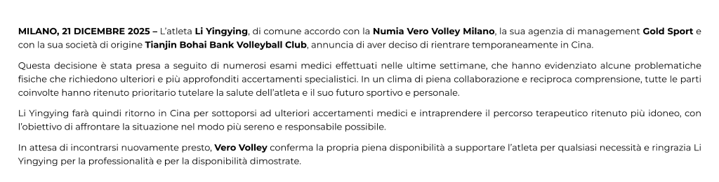 对于李盈莹回国一事,米兰排球俱乐部也发布了声明,称“这一决定是在过去几周多次医学检查后做出的”“检查发现了一些需要进一步专业评估的身体问题”。米兰排球俱乐部感谢李盈莹的专业精神与合作态度,期待不久后再次相聚。