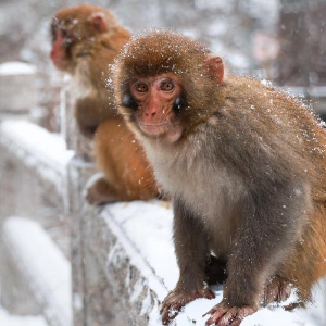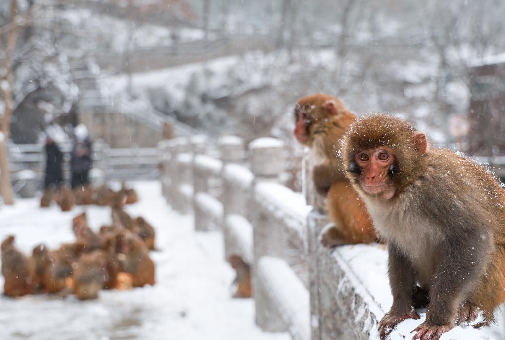 12月13日,一场降雪过后,在江苏省连云港市花果山景区玉皇阁,猕猴在护栏上歇息。新华社发(王健民摄)