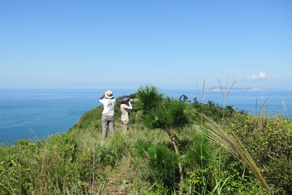 鸟类观测志愿者在长岛开展观测工作。新华社发(青岛市观鸟协会供图)