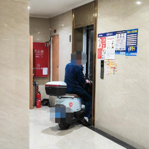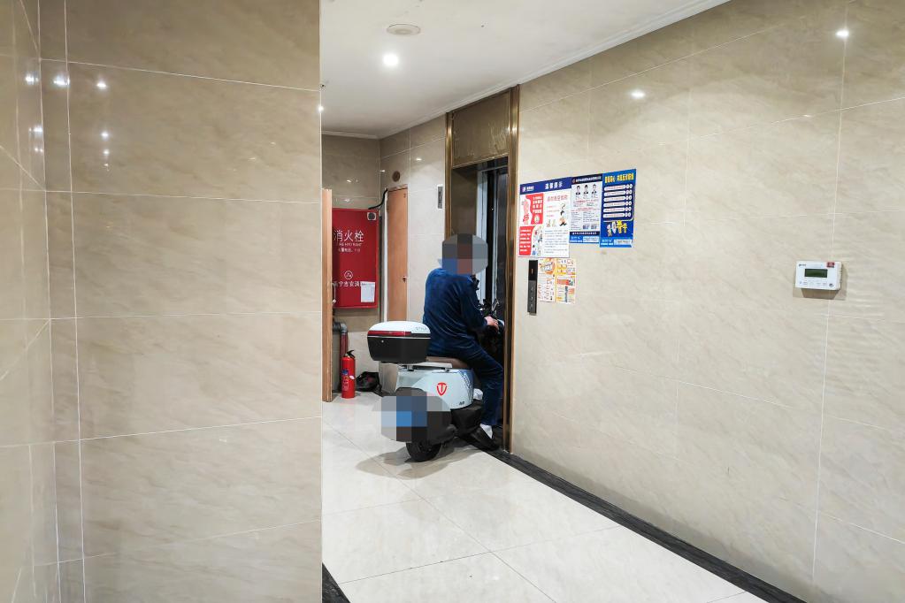 在广西某市一小区,居民骑着电动自行车进电梯(12月3日摄)。
