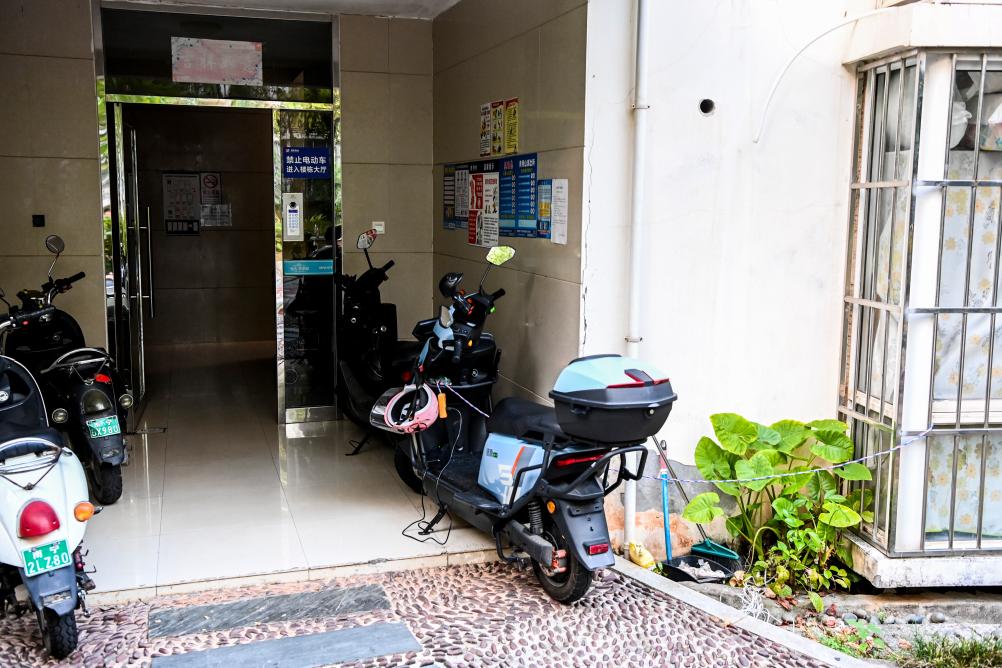 在广西某市一小区,住户将电动自行车停放在入户大厅门口进行“飞线”充电(9月20日摄)。