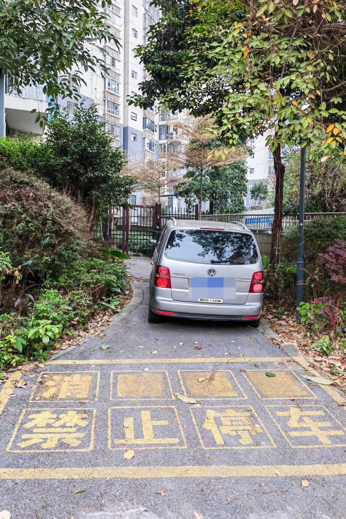 在四川某市一小区,两辆机动车停放在楼栋单元门前堵住疏散通道(12月5日摄)。