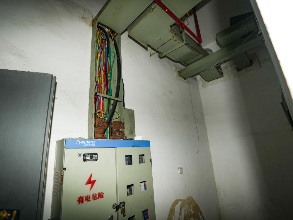 在四川某市一小区,地下室内的电箱电线无盖板保护(12月5日摄)。