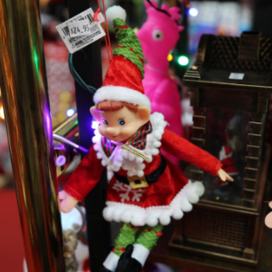 这是12月22日在美国纽约曼哈顿中城地区第七大道上的“圣诞小屋”礼品店内拍摄的“圣诞精灵”造型商品及其价签。新华社记者 刘亚南 摄