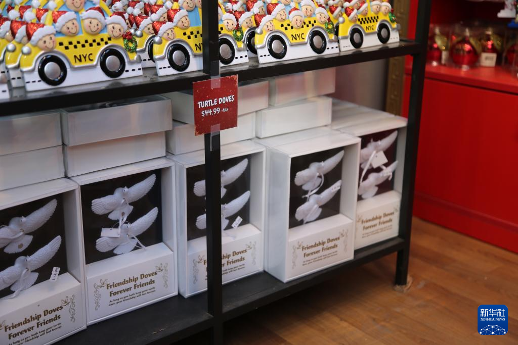 这是12月22日在美国纽约曼哈顿中城布莱恩特公园的“圣诞工坊”礼品店内拍摄的“友谊鸽”及价签。新华社记者 刘亚南 摄