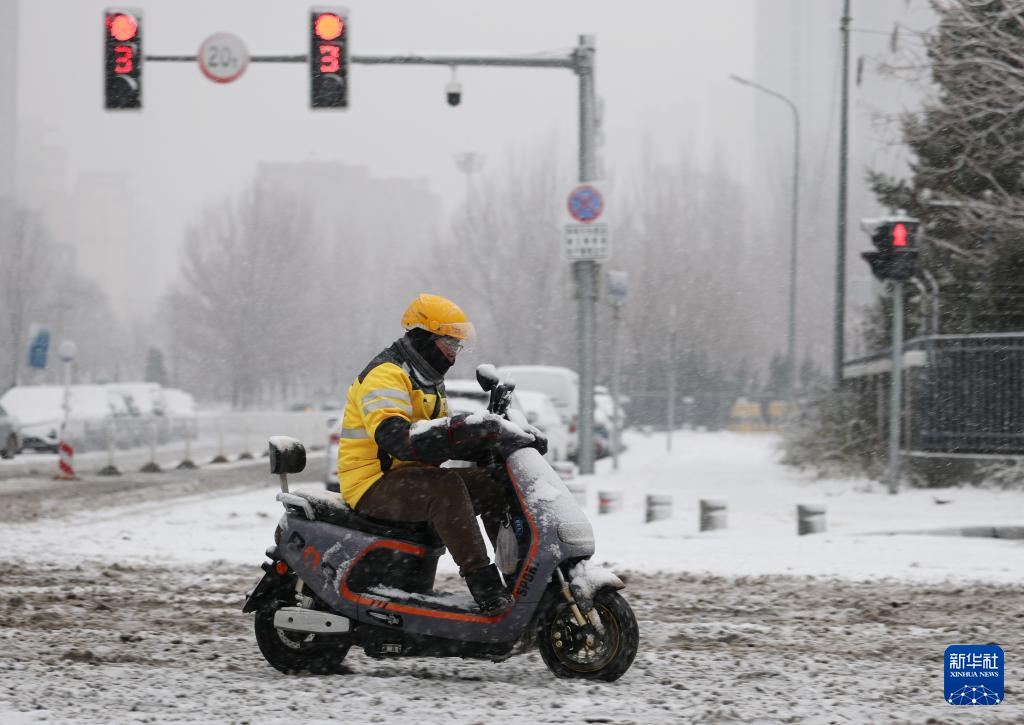 12月23日,一名外卖员冒雪行进在沈阳街头。新华社记者 李钢 摄