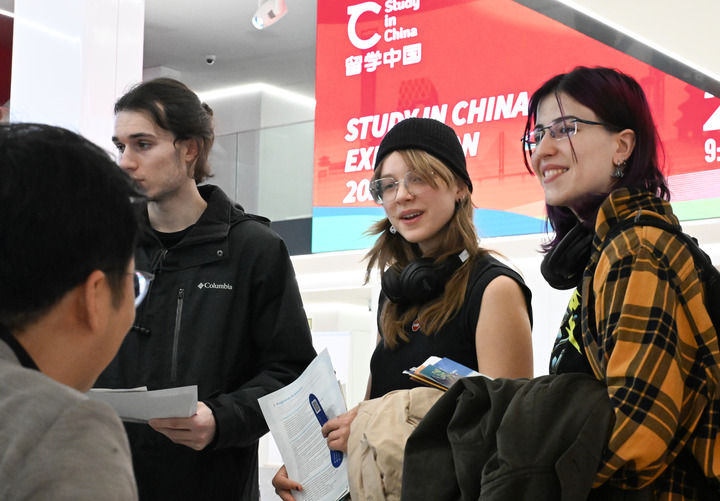 11月21日,在西班牙首都马德里,西班牙青年在2025年西班牙“留学中国”教育展上咨询。(程敏 摄)