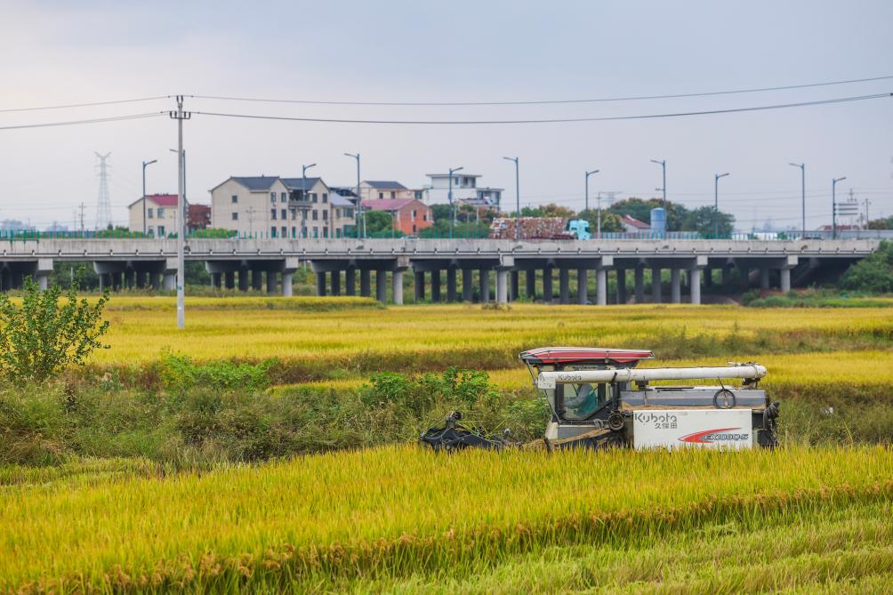 这是10月22日,收割机在浙江省金华市金东区塘雅镇万亩良田示范区收割水稻。新华社记者徐昱摄