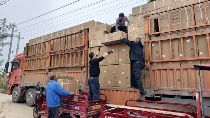在平顶山市叶县仙台镇黄李村,安装工人正在搬卸暖风机。受访人供图