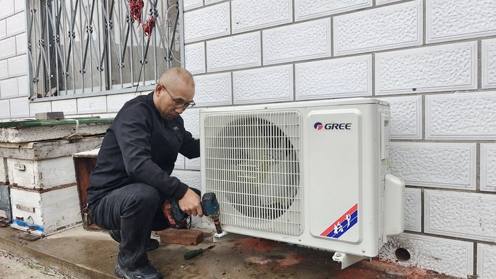 在平顶山市叶县田庄乡康台村,安装工人正在加装暖风机外机。受访人供图
