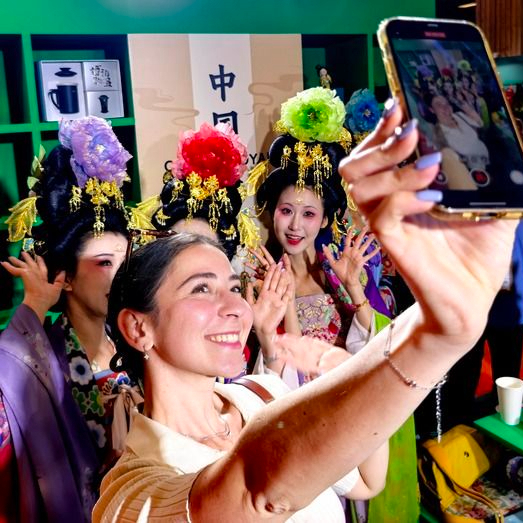 4月30日,一名参观者与唐代仕女妆造的中方参展人员在法国巴黎博览会上合影。(曾宪平 摄)