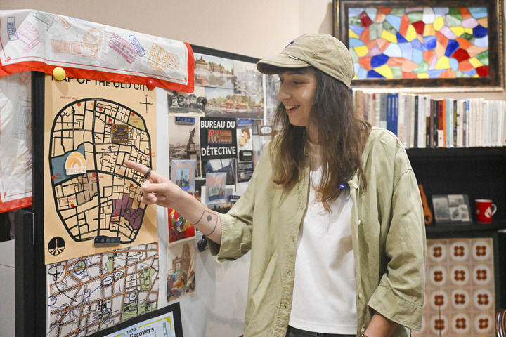 9月22日,乐盖曦在工作室介绍自己探索的City Walk(城市漫游)路线。(陈浩明 摄)
