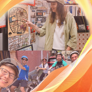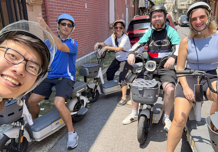 “东行记”团队导游带领外国游客在上海的弄堂里骑行电动车(受访者供图)
