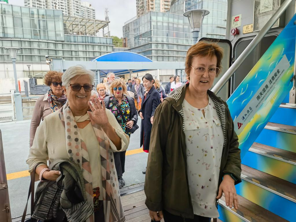 11月5日,来自西班牙等国的游客登上黄浦江游船。新华社记者 陈爱平 摄