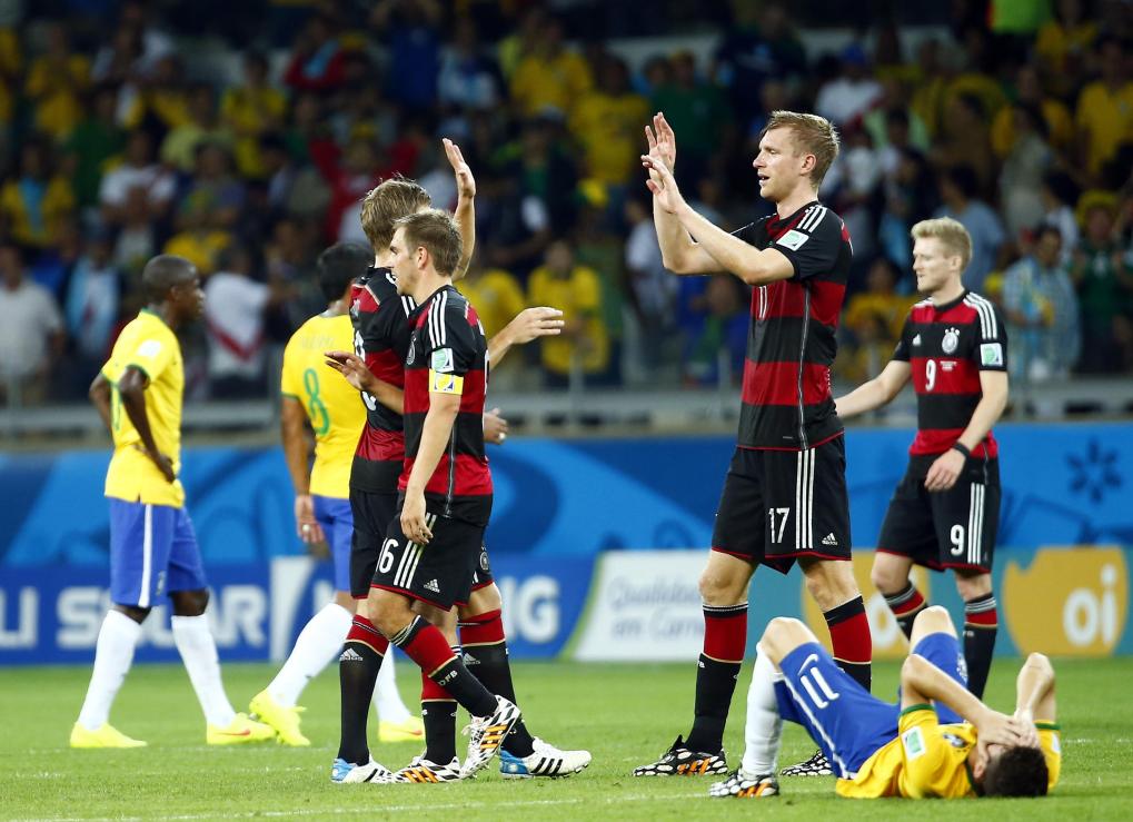2014年7月8日,在巴西贝洛奥里藏特米内罗大球场进行的2014年巴西世界杯半决赛中,德国队以7比1战胜巴西队。新华社记者陈建力摄