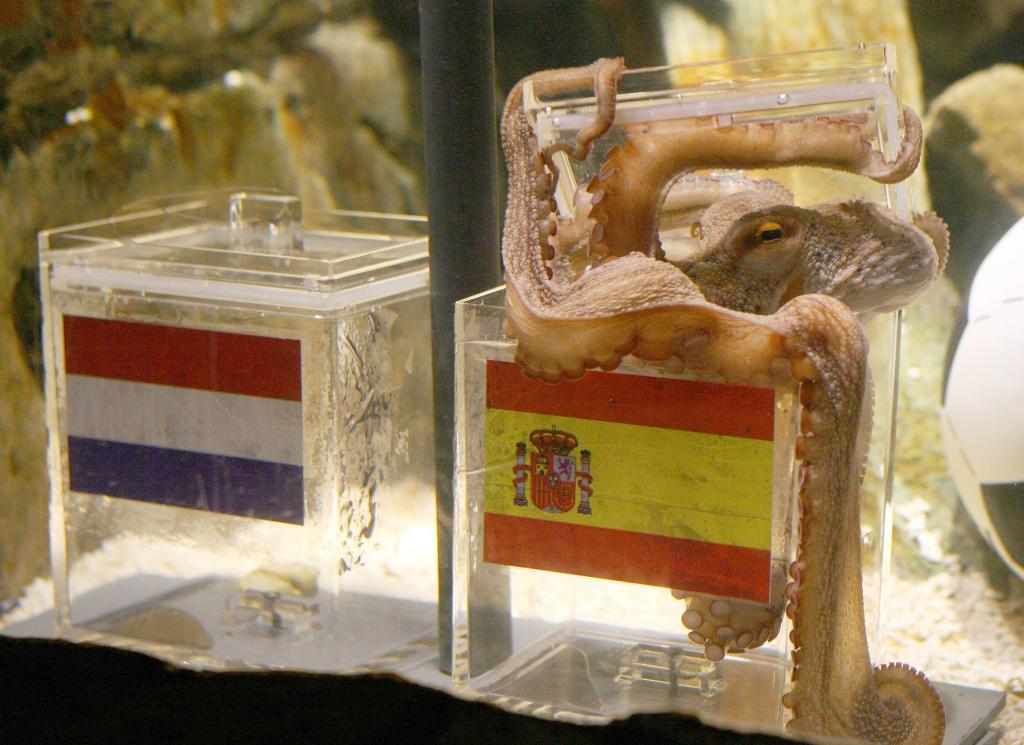 2010年7月9日,章鱼保罗“预测”西班牙队将在决赛中战胜荷兰队的资料照片。新华社/法新