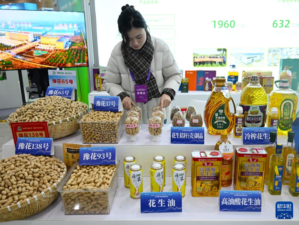 12月26日,在2025乡村振兴与产业发展大会现场,河南省农业科学院花生研究所工作人员在整理产品。新华社记者 郝源 摄