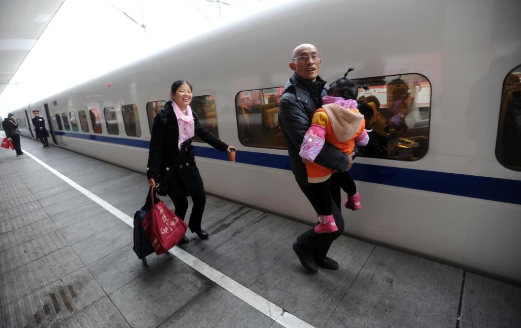 ↑2012年1月8日,长沙火车站站台,一名男子抱着小女孩奔向列车车门。当日,2012年的春运开始。新华社记者 李尕 摄