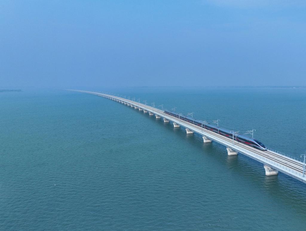 ↑2024年12月26日,列车驶过沪苏湖高铁元荡湖段(无人机照片)。当日,上海经苏州至湖州高铁(沪苏湖高铁)开通运营。新华社记者 邢广利 摄