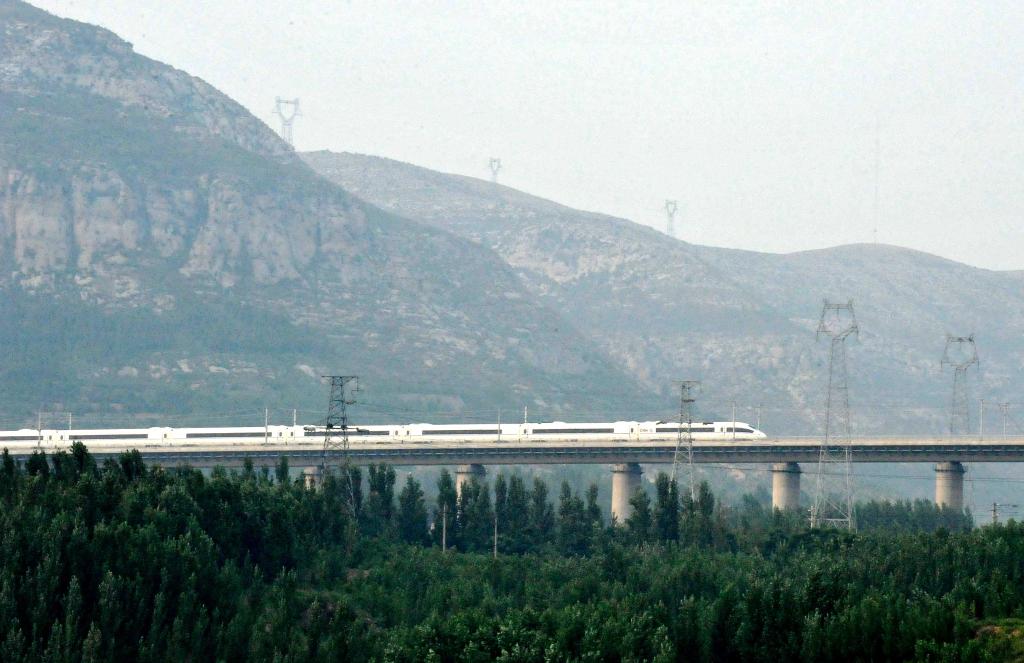 ↑2011年6月30日,G1次列车在泰山山麓通行。当日,京沪高铁正式开通运营。新华社记者 朱峥 摄
