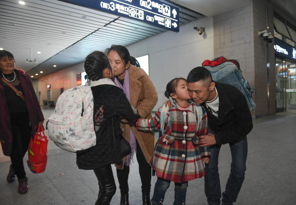 ↑2019年1月24日,在福州南站,黄诗韵(左二)、黄嘉韵(右二)姐妹俩亲吻前来接站的父母。这是黄诗韵、黄嘉韵第一次坐高铁来到遥远的福建。新华社记者 宋为伟 摄