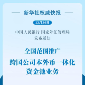 新华社北京12月26日电(记者刘开雄、吴雨)中国人民银行、国家外汇管理局12月26日发布通知,在总结前期部分地区试点经验的基础上,决定在全国范围内推广跨国公司本外币一体化资金池业务,并于发布之日起实施。