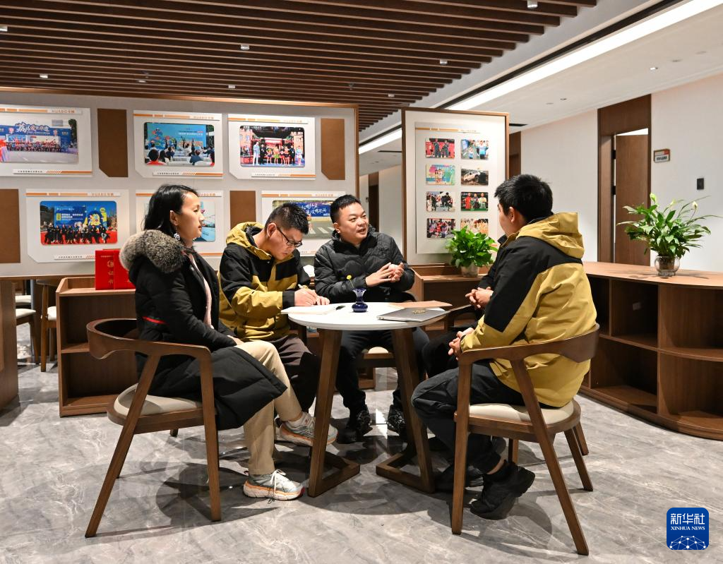 12月22日,一家入驻锦宾国际酒店的体育赛事运营企业员工商讨工作。新华社记者 刘坤 摄