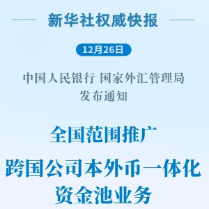 中国人民银行、国家外汇管理局12月26日发布通知,在总结前期部分地区试点经验的基础上,决定在全国范围内推广跨国公司本外币一体化资金池业务,进一步便利跨国公司集团资金归集、提高资金使用效率。该通知自发布之日起实施。