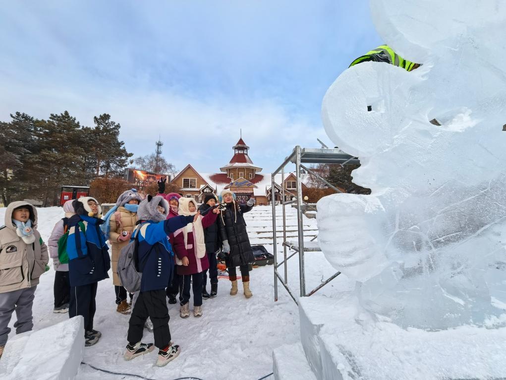 哈尔滨市继红小学校的学生在观摩学习冰雕技艺。(受访者供图)