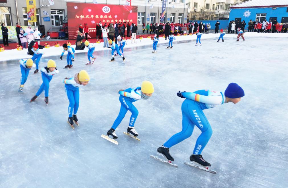 在2025年哈尔滨市“中小学生冰雪周”启动仪式上,哈尔滨市清滨小学校的学生表演冰上节目《龙腾狮舞》。新华社记者 沈易瑾 摄