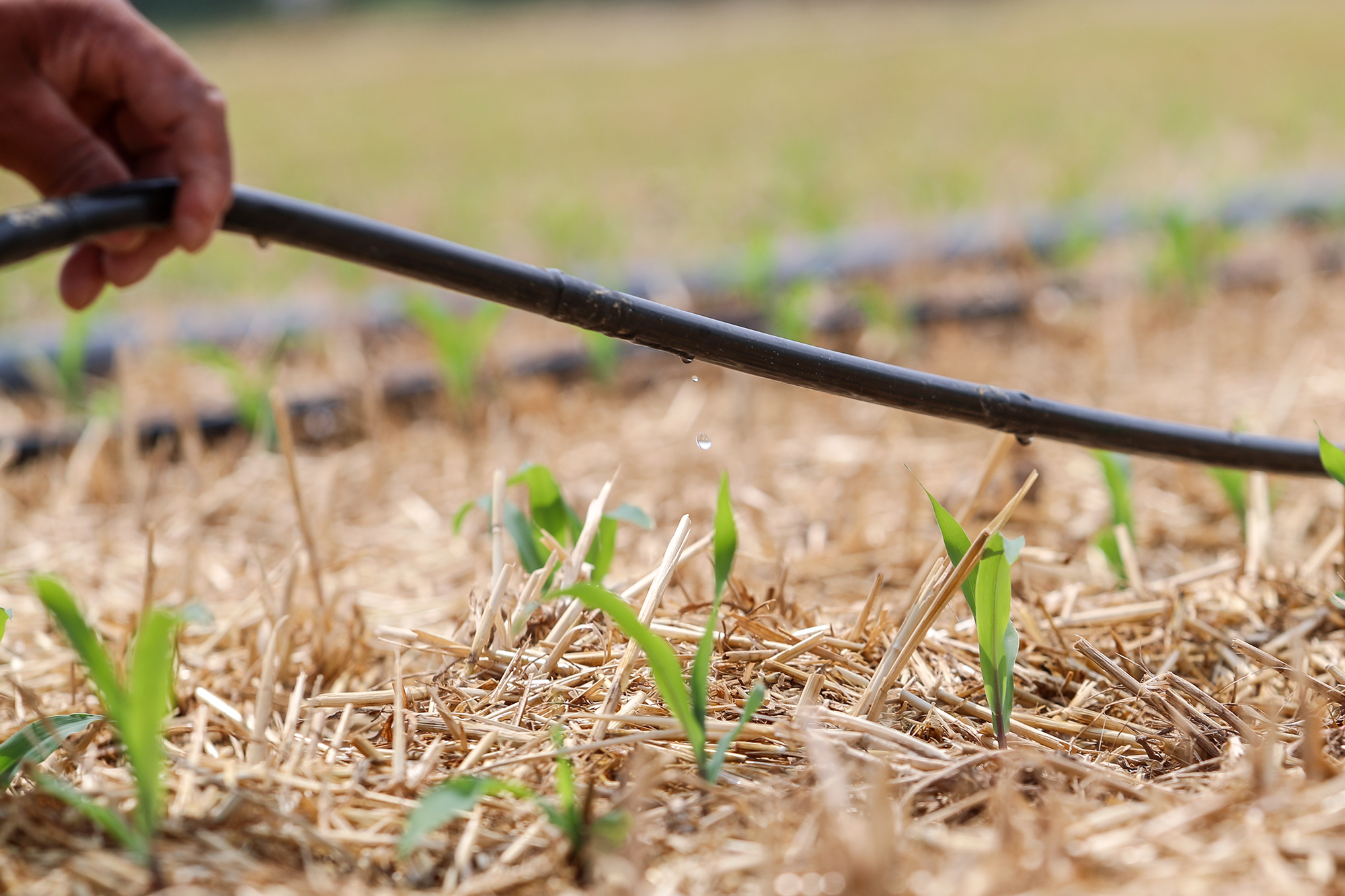 2025年6月18日,村民在河南省商丘市梁园区闫庄新村玉米地里开展节水灌溉作业,查看滴灌设施运行情况。新华社发(李恒 摄)