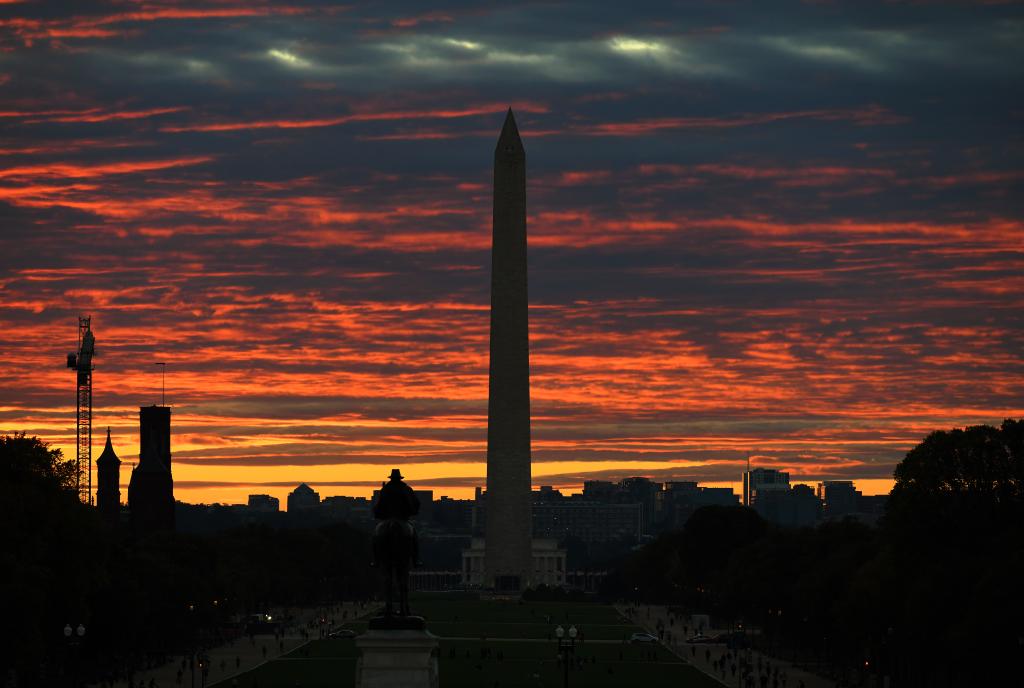 这是10月15日拍摄的日落时分的美国华盛顿纪念碑。新华社记者李睿摄