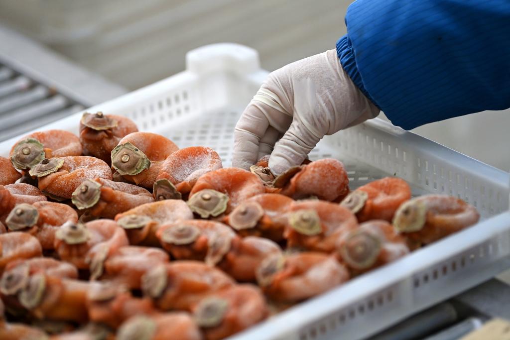 在陕西富平大方天玺绿色农业发展有限公司生产车间,工人将分拣好的柿饼码放装盒。新华社记者 李一博 摄