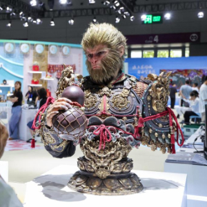 2025年5月23日,观众在深圳举行的第二十一届中国(深圳)国际文化产业博览交易会上拍摄黑神话悟空半身像。