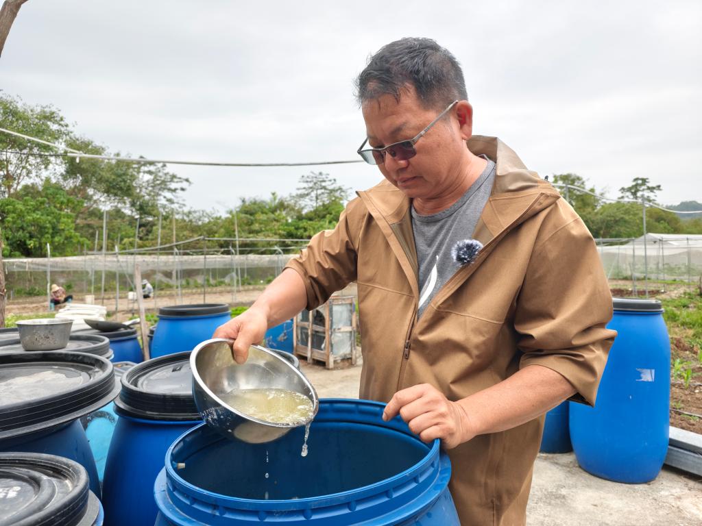 12月10日,在香港元朗石湖围新村,鸿日农庄主理人黄展明检查自制酵素的成色。新华社记者 刘英伦 摄