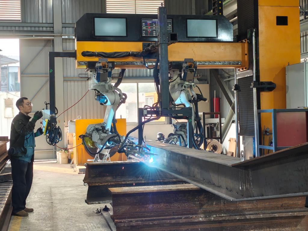 在和利绿色动力有限公司位于香港粉岭的焊接工厂,梁志豪身着工装夹克,站在显示屏前输入指令,两只机械臂就“左右开弓”,不到两小时就把一段6米长的H型高强度钢材焊接完毕。在引进这套智能技术方案之前,同样的工作需要两个技工戴上厚重的防护头盔,身穿“气鼓鼓”的降温风扇外套,在四溅的火花中用烙铁手动完成。
