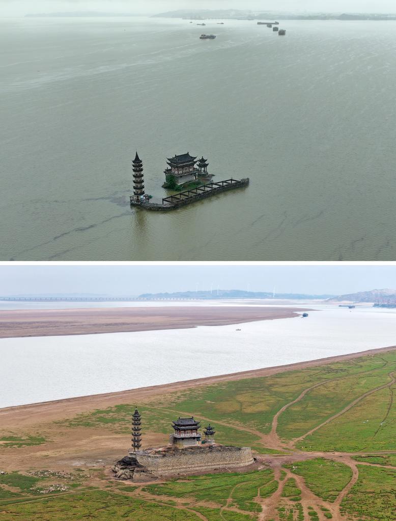 拼版照片:上图是2024年6月28日拍摄的鄱阳湖丰水期时的落星墩及周边水域(无人机照片,新华社记者 万象摄);下图是2025年12月13日拍摄的鄱阳湖水位下降后的落星墩(无人机照片,韩俊烜摄)。