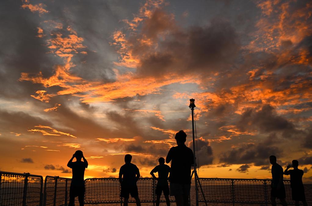 2024年6月23日,中国海警鹤宝舰执法员在黄岩岛附近海域观赏晚霞。