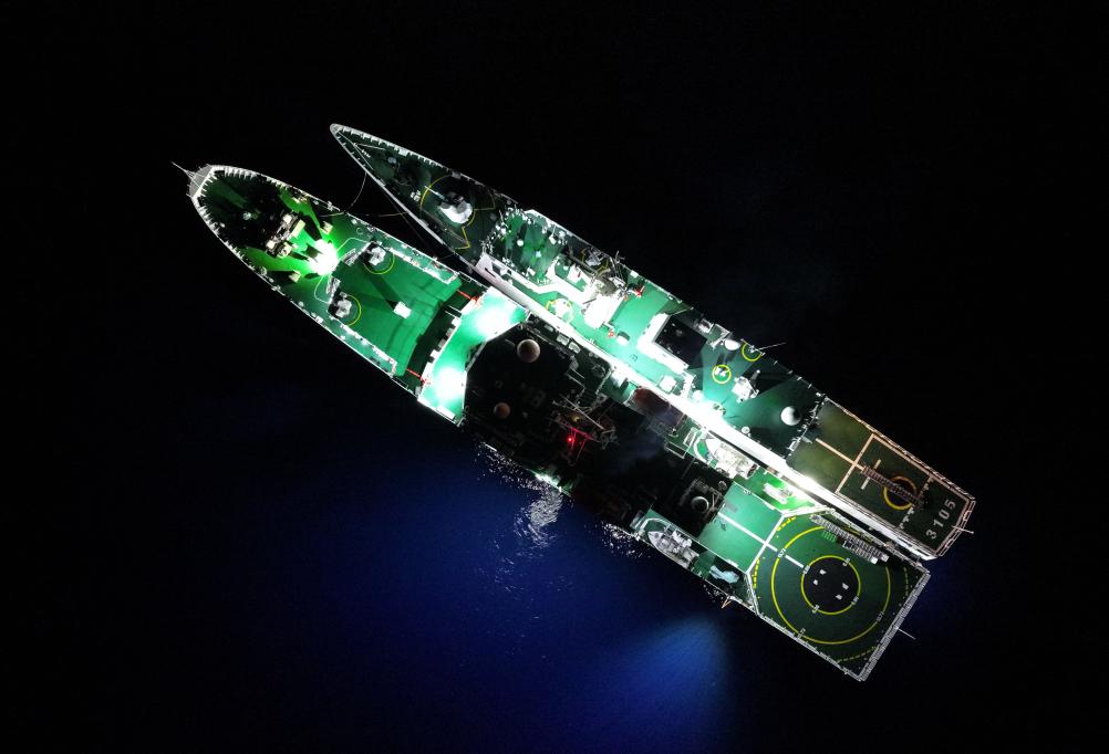 2024年6月30日,中国海警川山舰(下)、鹤宝舰在我国黄岩岛附近海域进行夜间靠泊燃油补给训练。