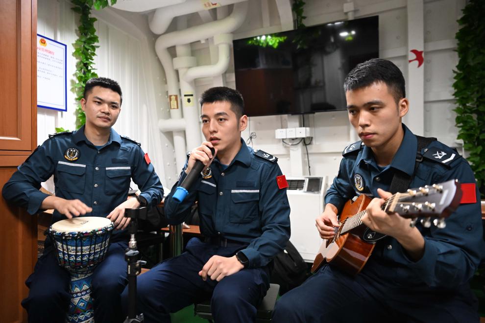 2024年7月19日,中国海警鹤宝舰执法员在阅览室弹唱。