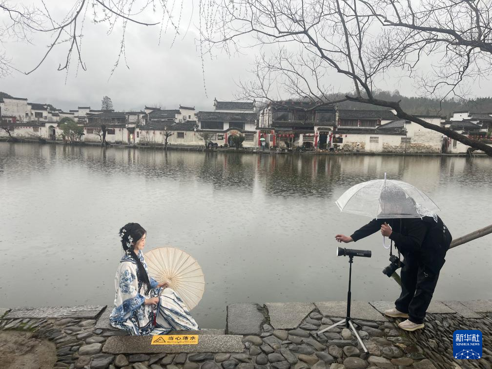 2025年3月13日,游客在安徽省黄山市黟县宏村镇宏村拍照。