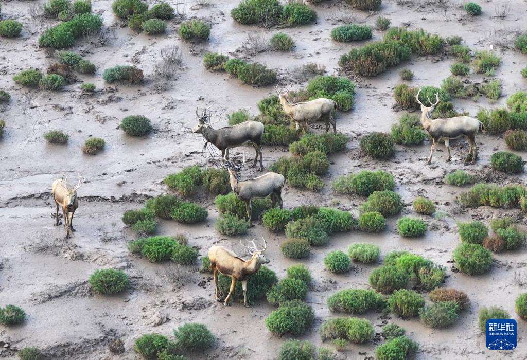 2025年8月25日,野生麋鹿栖息在江苏省盐城市东台条子泥湿地川水湾(无人机照片)。