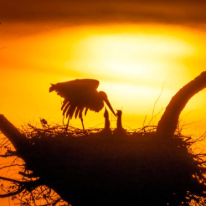 2025年5月18日,在黑龙江扎龙国家级自然保护区克钦湖,东方白鹳在晨光中哺育雏鸟。